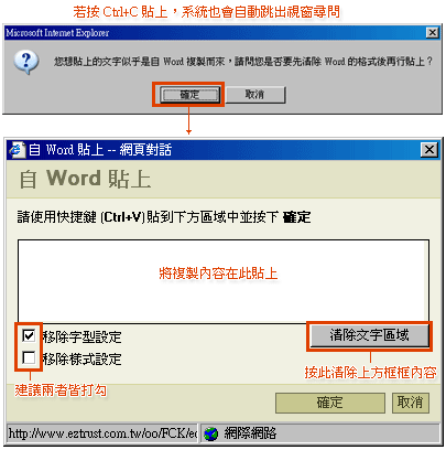 自Word貼上:若從Word複製來的內容,請按此按鈕貼上,便會跳出清除Word格式視窗,強烈建議您清除word樣式,以免發生與編輯器衝突之問題。
