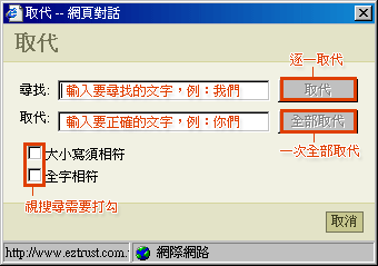取代:可利用此功能將內容中所有關鍵字一次尋找取代為正確內容,例:內容中所有的【我們】改成【你們】。