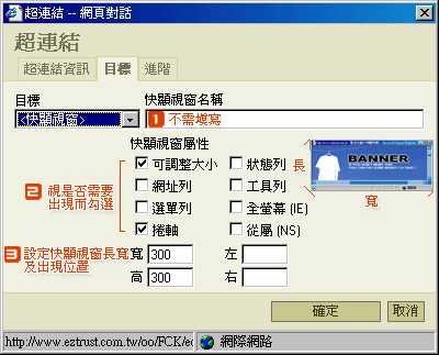 點選目標,下拉選擇快顯視窗,設定如下: |