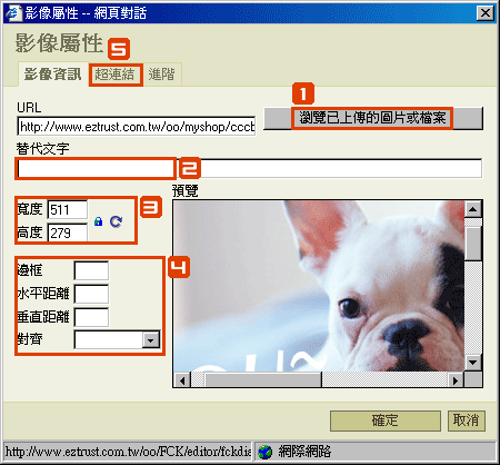 按下 開啟檔案(圖片)管理系統 ,選擇上傳圖片,便可在預覽框內看到此圖,URL也會顯示圖片路徑。 |
