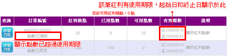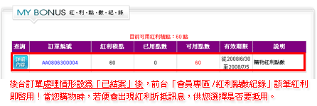故在會員需知或是購物需知中加註提醒會員,以免造成客訴。若客訴狀況嚴重一定要歸還可用紅利時,您可在後台將該筆訂單處理情形先改為「未處理」再改為「已結案」,則點數便可使用,使用期限依你更改當天為起始日。(因為此動作可能會影響報表及銷售排行,故非必要請勿依此操作) |