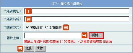 圖片上傳:若您要顯示圖片banner連結,請點選「瀏覽」上傳您的圖片;若您只想要在前台顯示連結文字,可忽略此選項。