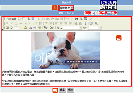 編輯內容:編輯活動頁面內容。此欄位提供您編輯器使用,善用編輯器可編輯出較活潑豐富的訊息內容。