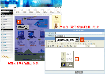 「活動頁面」單元,可以公告網站最新活動內容〈如:特價商品、促銷活動...等〉,建議可圖文並茂吸引瀏覽者。「活動頁面」也可以配合電子報發送,讓會員能隨時掌握最新活動。展開 發送電子報方法